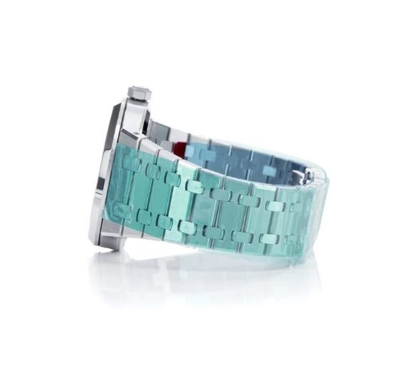 Silver-toned dial with “Grande Tapisserie” pattern, white gold applied hour-markers and Royal Oak hands with luminescent coating. Stainless steel bracelet with AP folding clasp. Powered by the natural movements of your wrist.